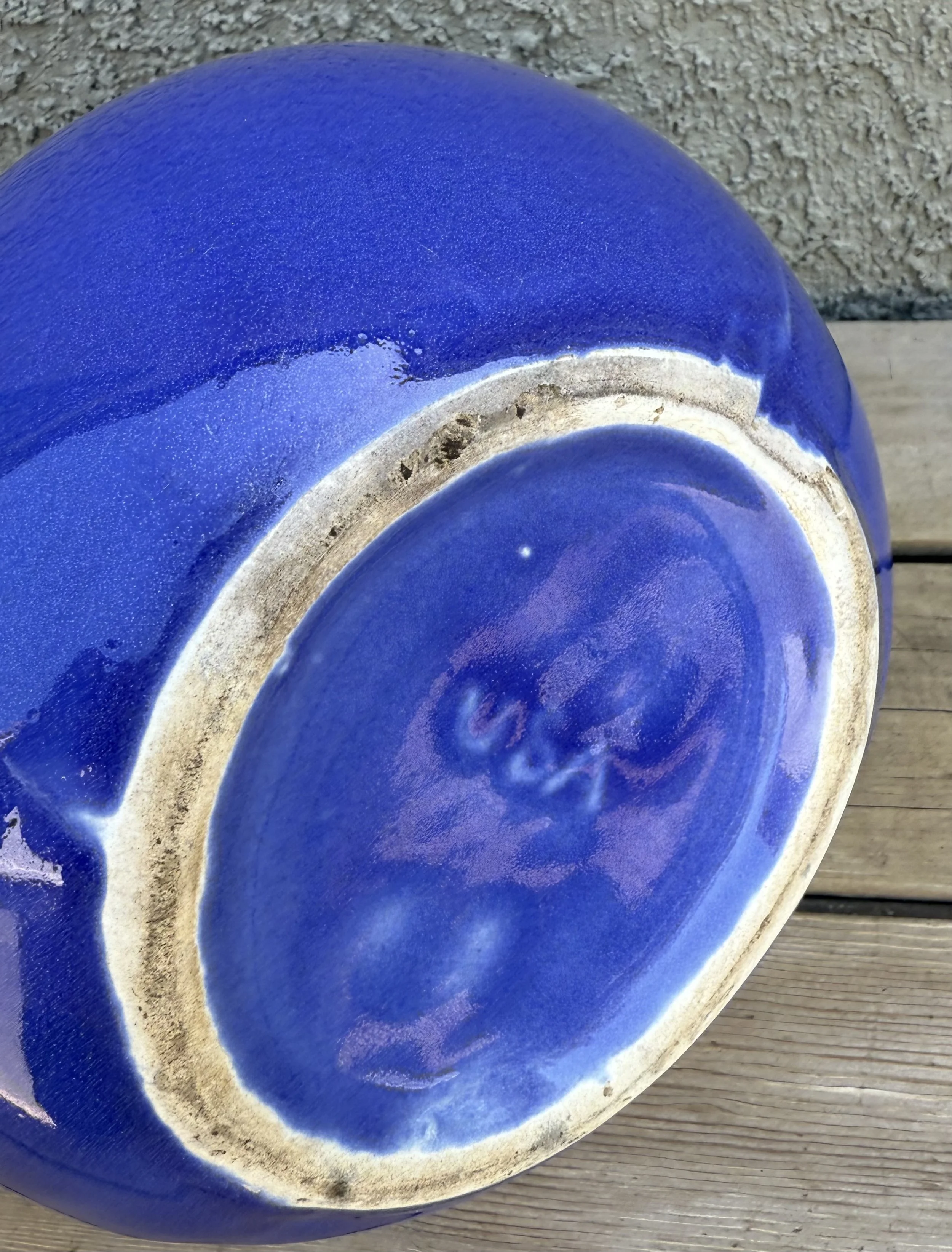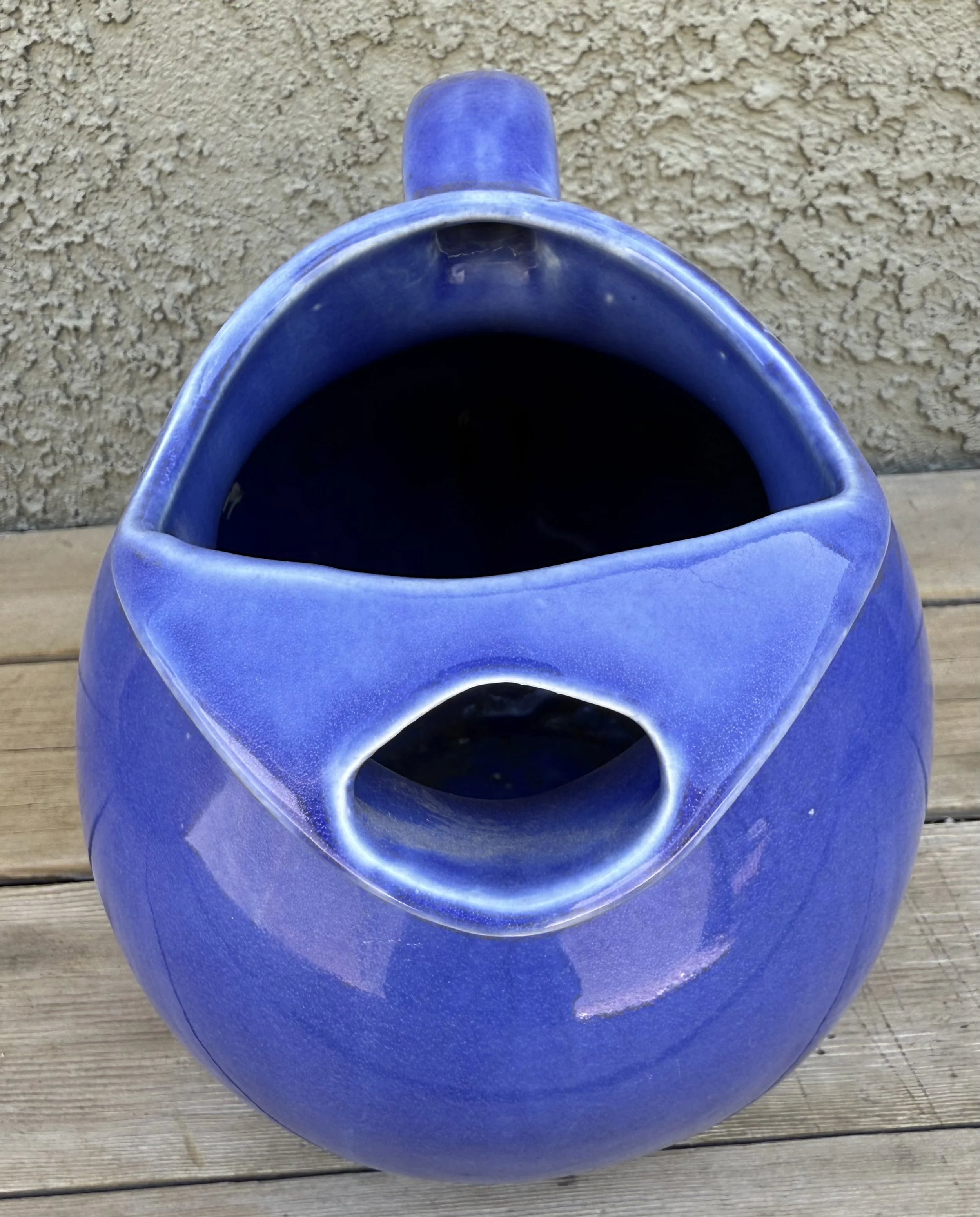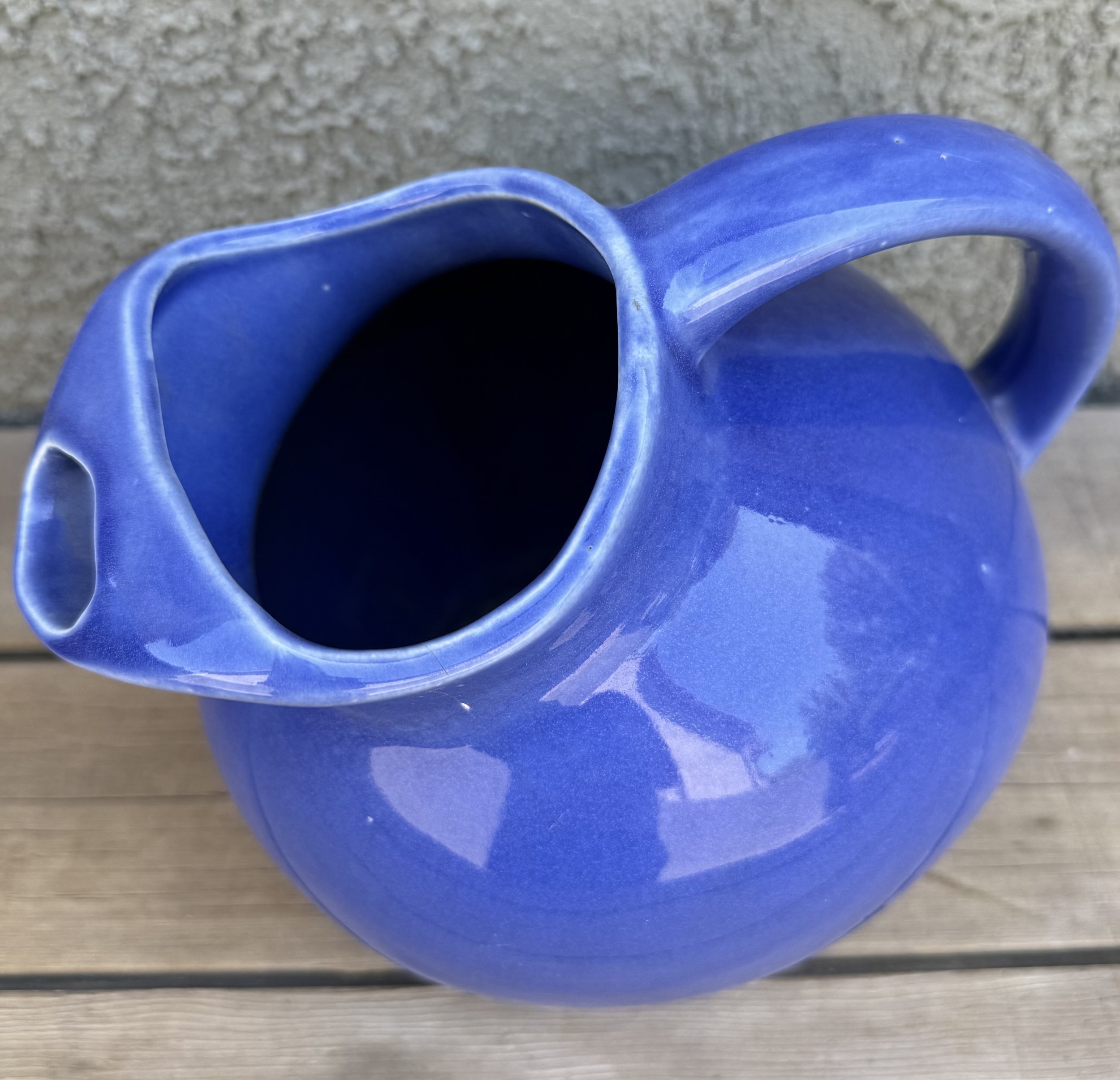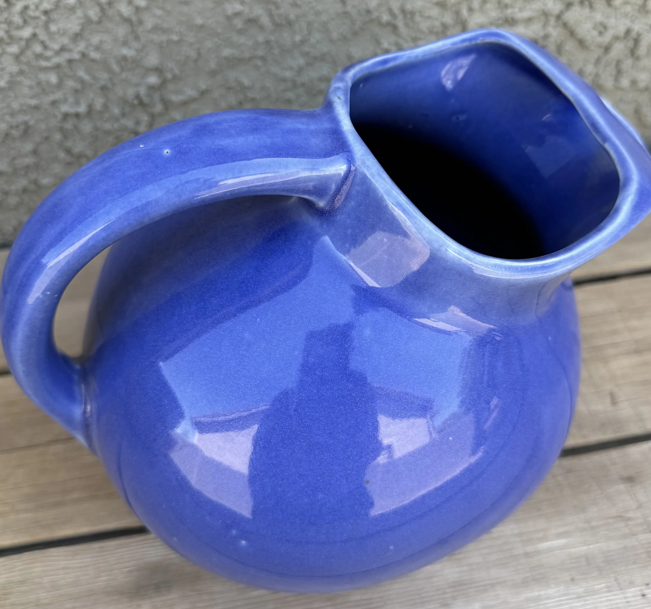 An antique, collectible, retro, blue, USA pottery jug. Wonderful primitive kitchen decor.