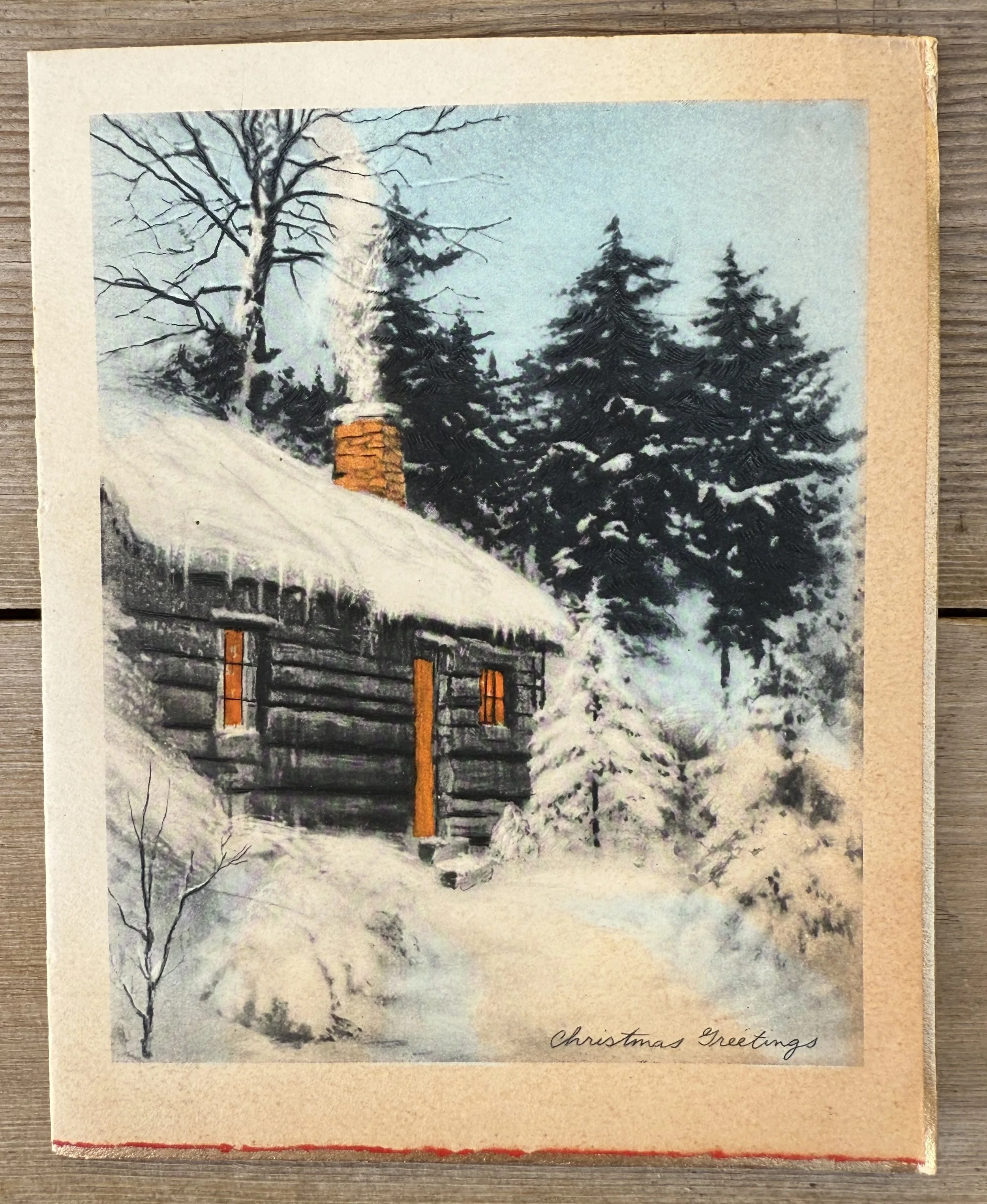 A vintage, collectible, Christmas greeting card depicting a snow covered, rustic winter cabin lanscape. Great for collecting or use in scrapbooking craft and art projects.