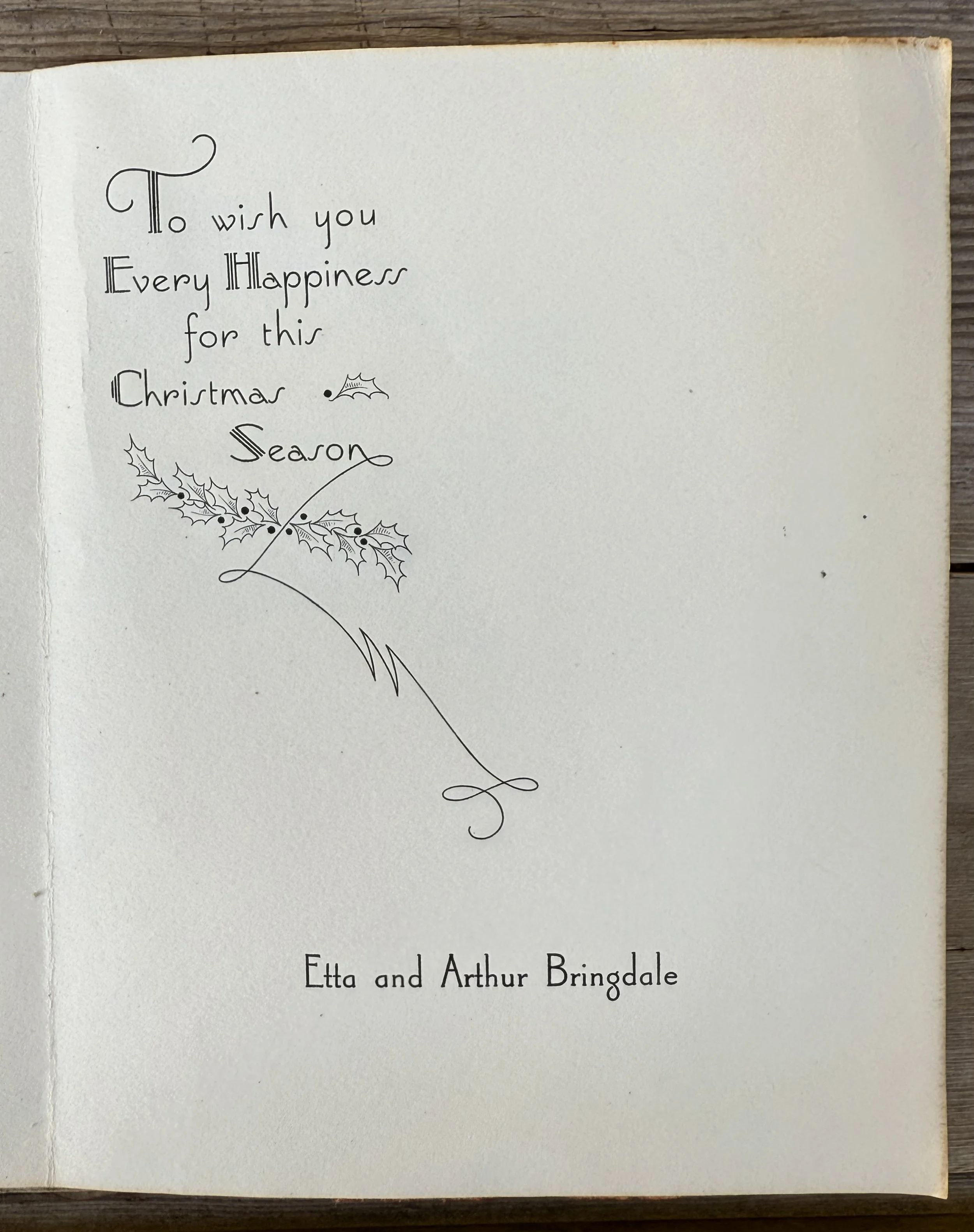The card has some old glue from previously being attached in a scrapbook, from which it has been torn out of, showing tearing on reverse, also printed with the senders names ‘Etta and Arthur Bringdale’ inside, please see all images, sold as seen, no returns.