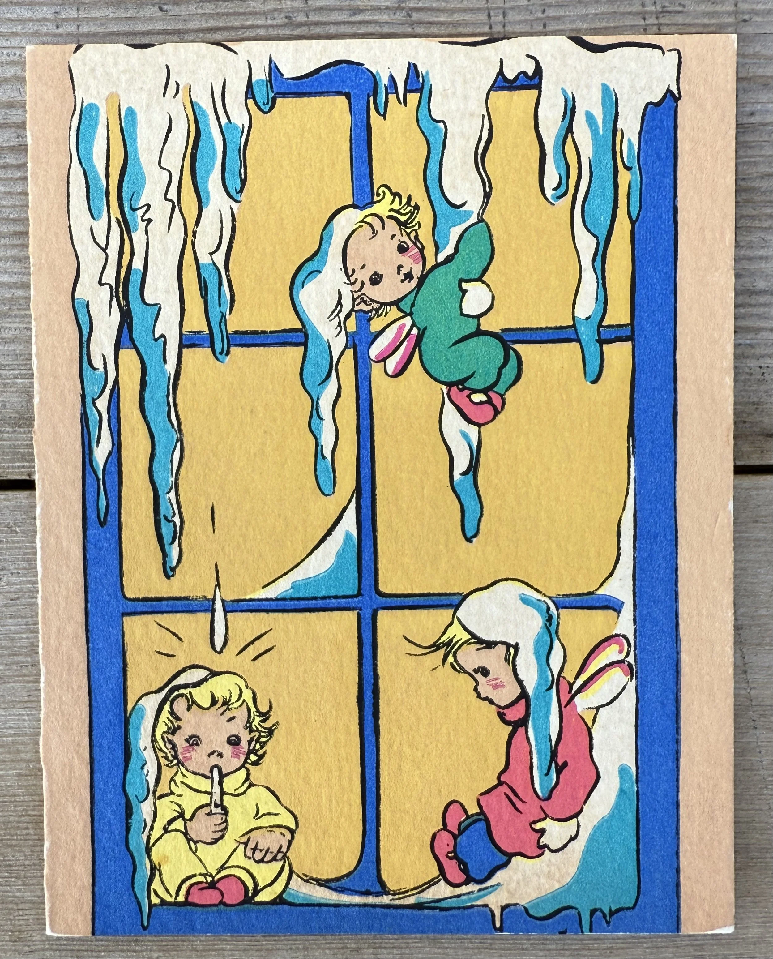 A vintage, collectible, Brownie greeting card depicting Christmas icicles with figures. Great for collecting or use in scrapbooking craft and art projects.
