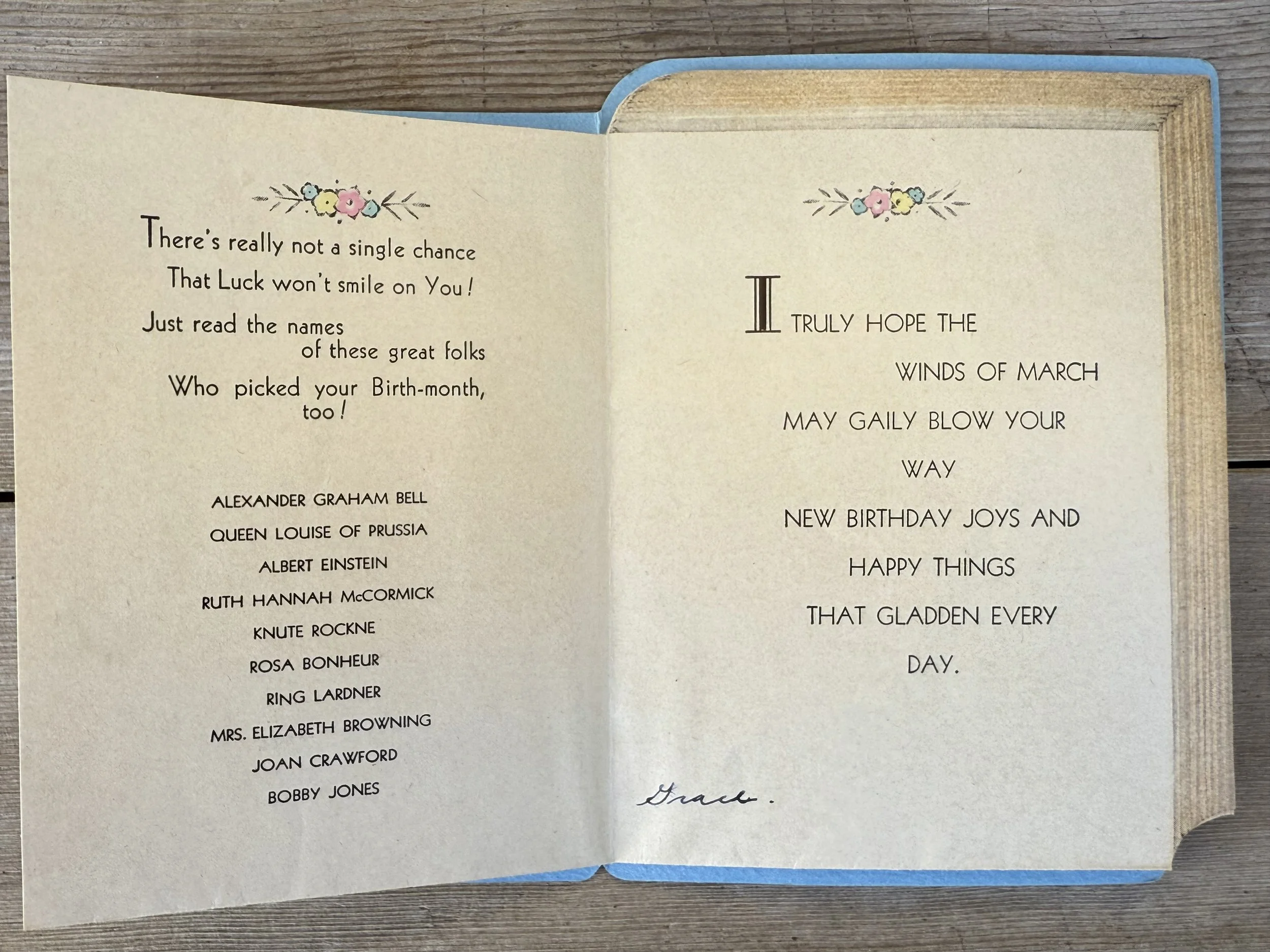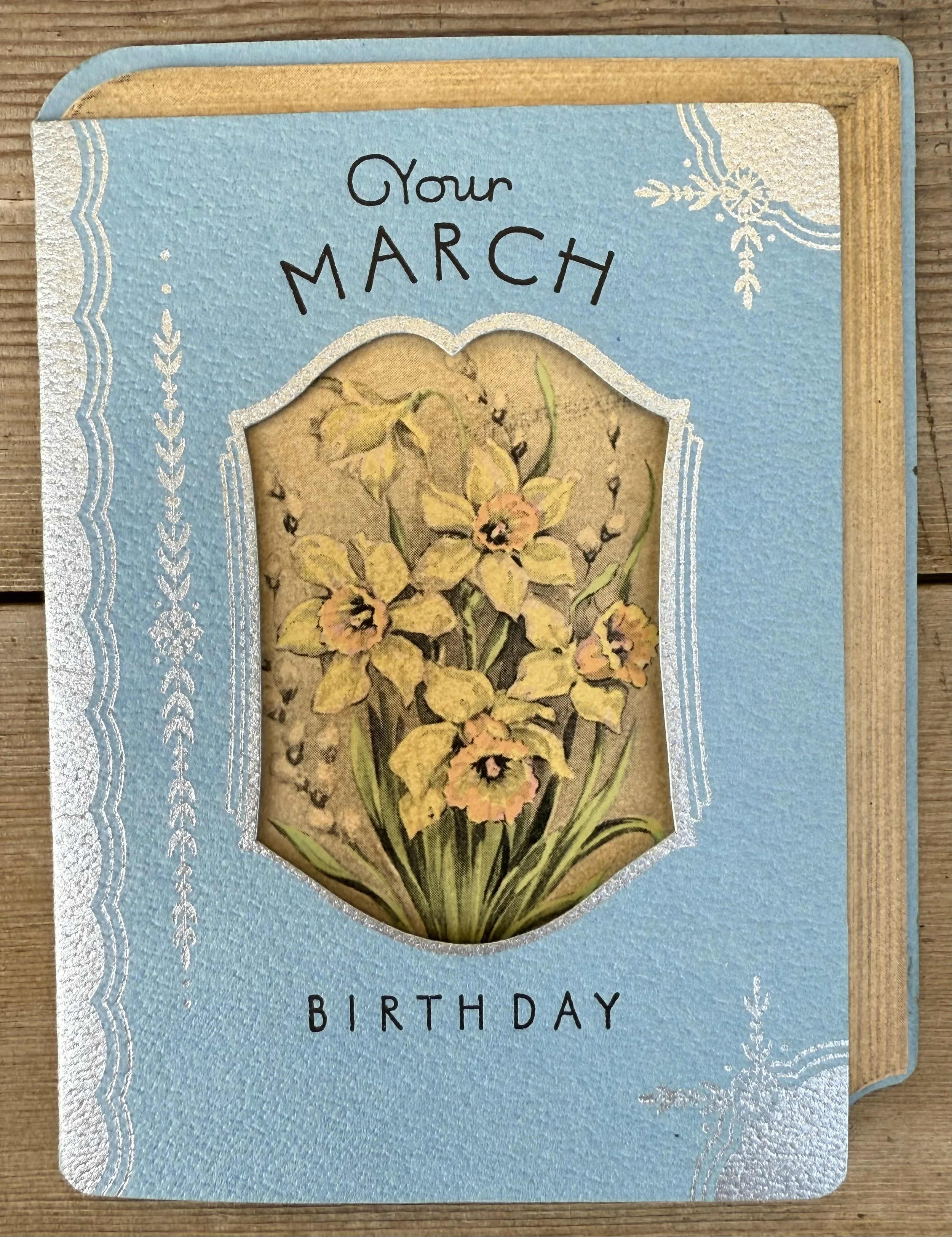 A vintage, collectible, greeting card depicting Spring daffodils for a March birthday, framed with soft blue and silver in the style of a book. Great for collecting or use in scrapbooking craft and art projects.